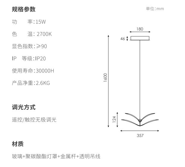 如翼吊灯用双层弯曲的造型作为主要造型特征形成在空间里自由灵动的造型,,以一定的角度倾斜,,,,形成丰富的画面,,,,两翼的线条均为精心设计,,,,精准控制光线的传播,,,将直下光和漫反射光结合,,,,70%灯光向下,,30%灯光向上,,在空间里形成舒适的光学效果,,下灯罩为片状玻璃印刷专门调制的乳白色油墨,,,热弯成对应弧度,,,,灯光透过灯罩呈现出更加柔和的视觉效果;边缘特意留有5mm宽度透明环,,,使视觉更精致轻巧;灯罩利用两个金属“领夹”式的杆连接固定,,,整体视觉优雅;