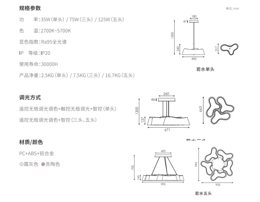 若水吊灯源于中国古典意境中的山水,,,外形如山的曲线婀娜蜿蜒,,,其内侧光晕水波纹,,,缓缓晕开;巧妙地将曼妙光影融于山水意境,,,如空间中悬浮的自然景观,,,,专门设计调试的水波纹棱面扩散罩可以起到一定的视觉防眩作用,,把原本进入到人眼的杂散光折射掉,,,同时可以提升产品的精致品质感;空间光的强功能性和强装饰性通常是个矛盾点,,但是若水则取得了一个平衡,,,,保证较强光学输出的同时可以有其装饰表现