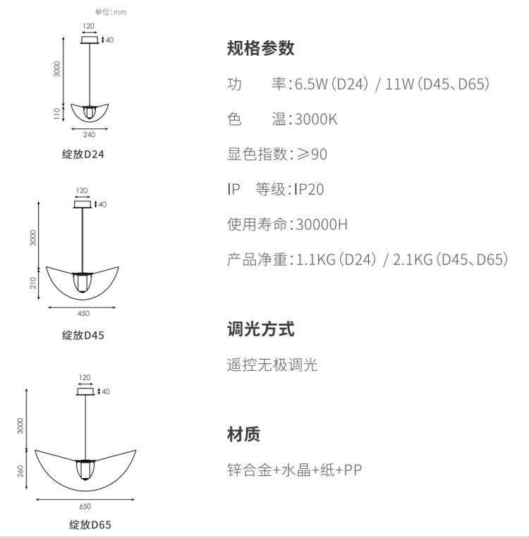 利用材料物理弹性,,,透过巧妙的结构,,,,灯罩在空间里呈现一个富有张力和生机的曲面,,,,仿佛在空间里热烈绽放的花朵,,灯罩表面采用手工敷纸工艺,,,更加的朦胧舒适,,纸纤维的材质也让灯光更加温柔。。。。选用实心高级无铅水晶材质,,,这种材料洁净无瑕的透明度与低色散特性,,硬度高,,,多用于精密光学器件及高端水晶制品,,更好展现丰富光影质感。。。